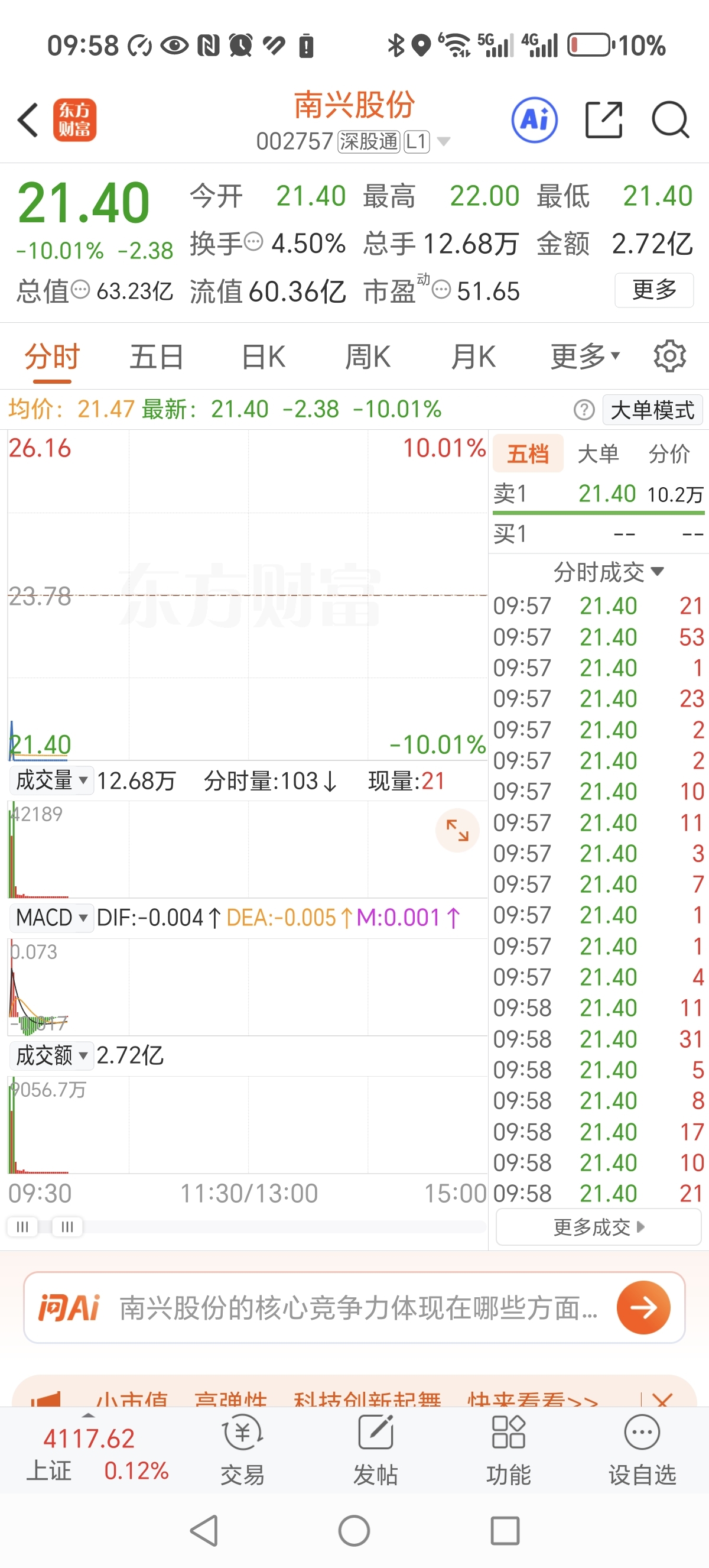 刚离开几天你他吗的就起飞了,这里错过大肉,昨天去南兴股份抄底,今天跌停出不来,当