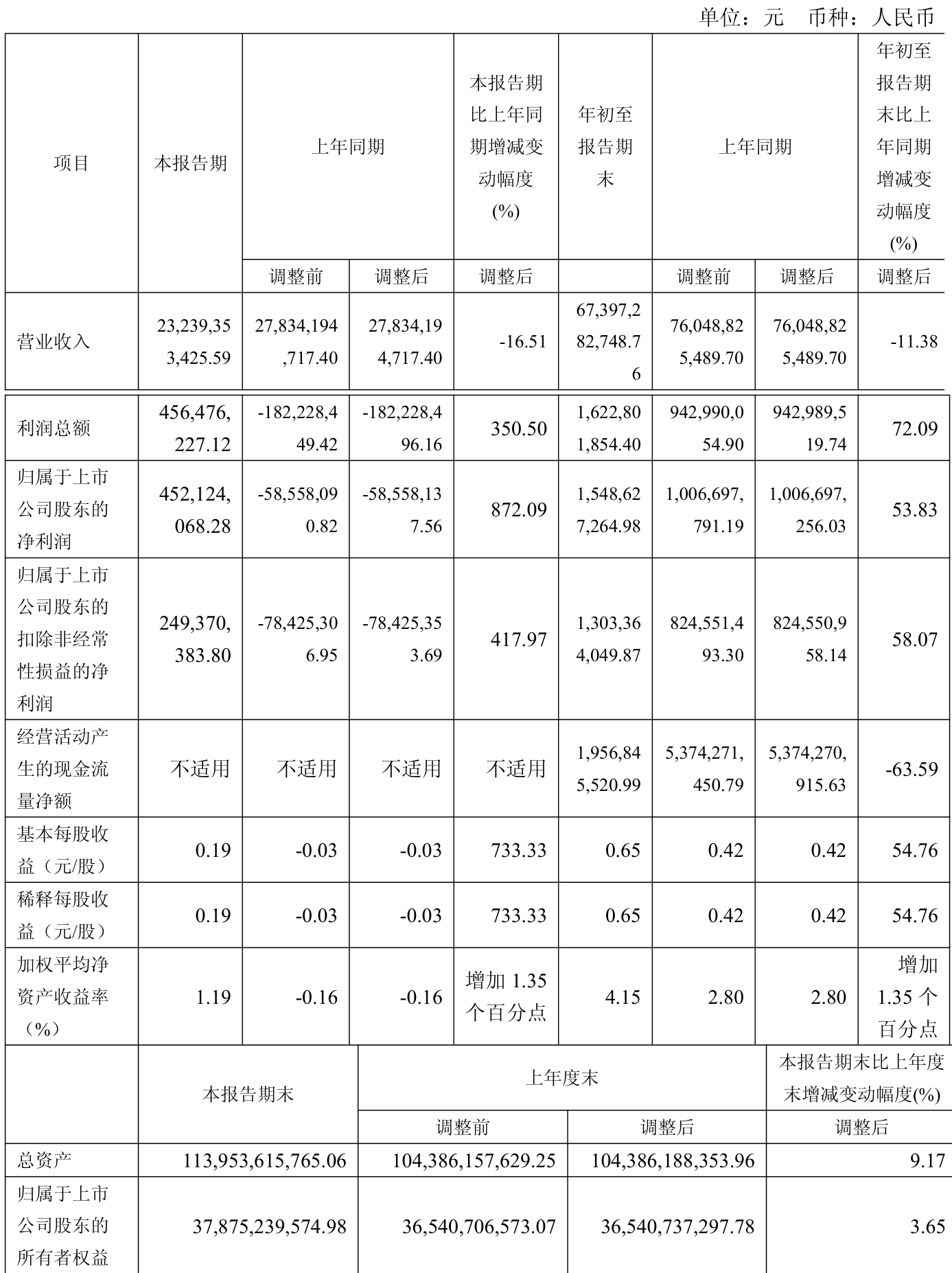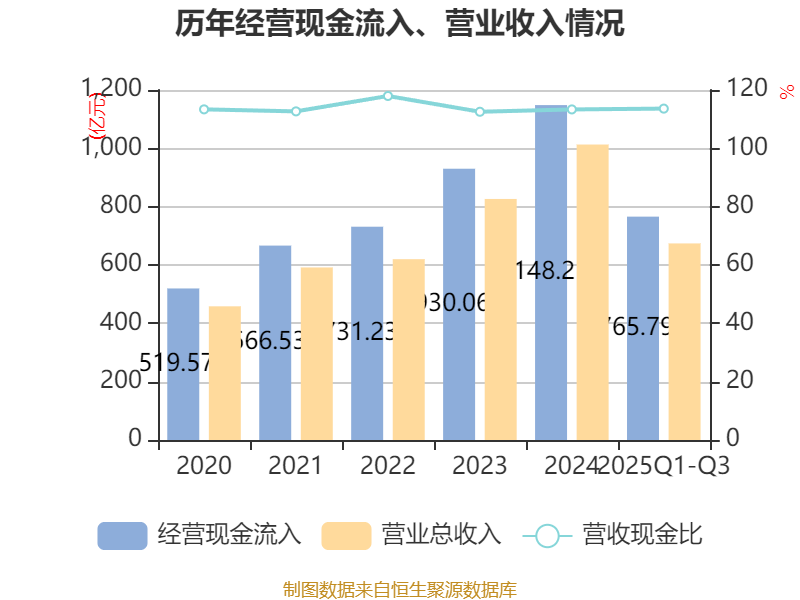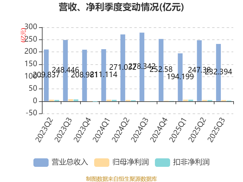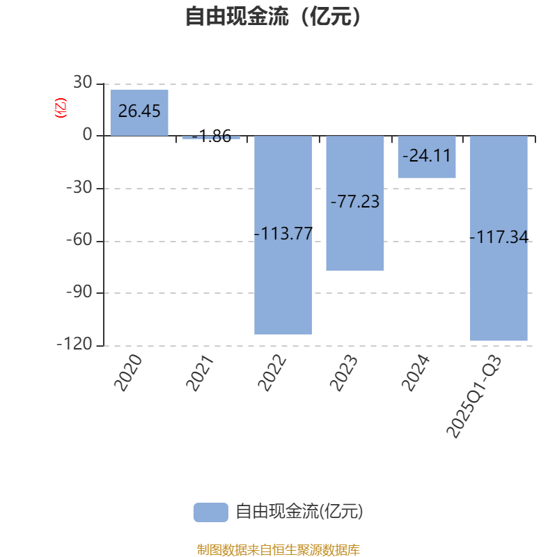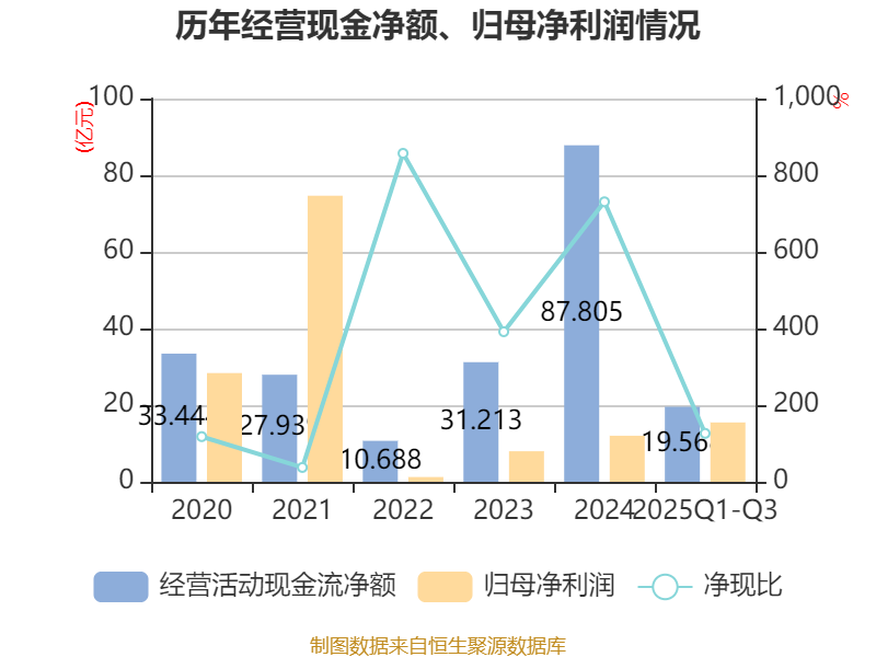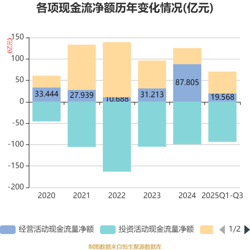 2025年前三季度,公司经营活动现金流净额为19.57亿元,同比下降63.59%;筹资活动现金流净额51.09亿元,同比减少17.94亿元;投资活动现金流净额-93.5亿元,上年同期为-84.17亿元。