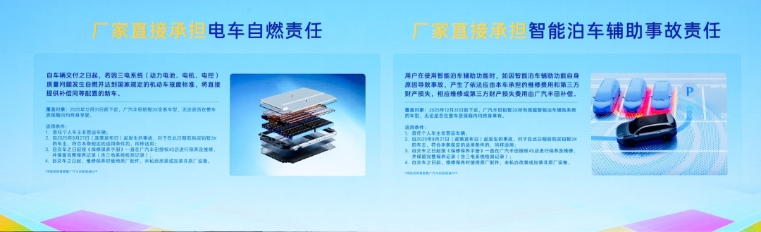 今年8月,广汽丰田举行用户大会,推出“电车自燃及智能泊车辅助事故厂家双担责”政策(下称“厂家双担责”)。即日起,铂智3X用户将享有自燃换新车、智能泊车辅助事故全赔的权益。不仅新购车用户享有,老车主也没落下。简而言之,主机厂不再隐藏在经销商和保险公司后面,主动站出来,为用户“兜底”。