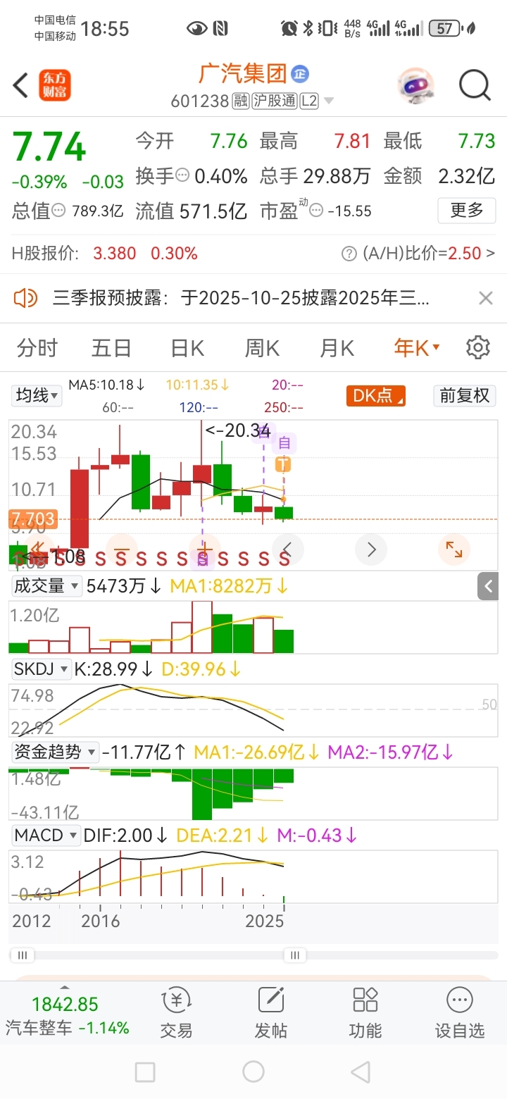 $广汽集团(SH601238)$ 年线已经跌了17%,位置还是很低的,机会大于风险。