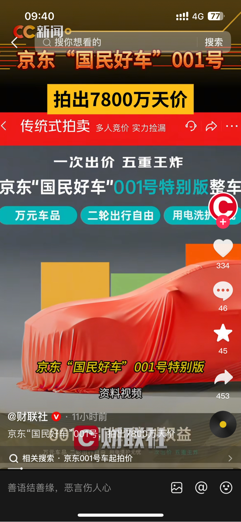京东一号车拍出7800天价,怎么也得涨到7.80股价吧