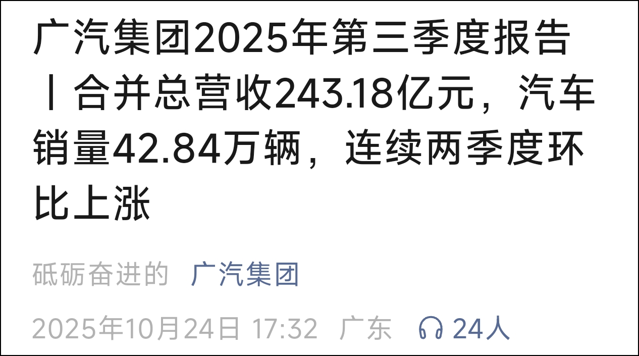$广汽集团(SH601238)$ 真够逗的,公众号都只敢写环比,同比和亏损都不敢写了,周一大跌妥妥的,现金流-100多亿怪不得要发债还拿利息了,这样下去加上计提年报得亏100亿