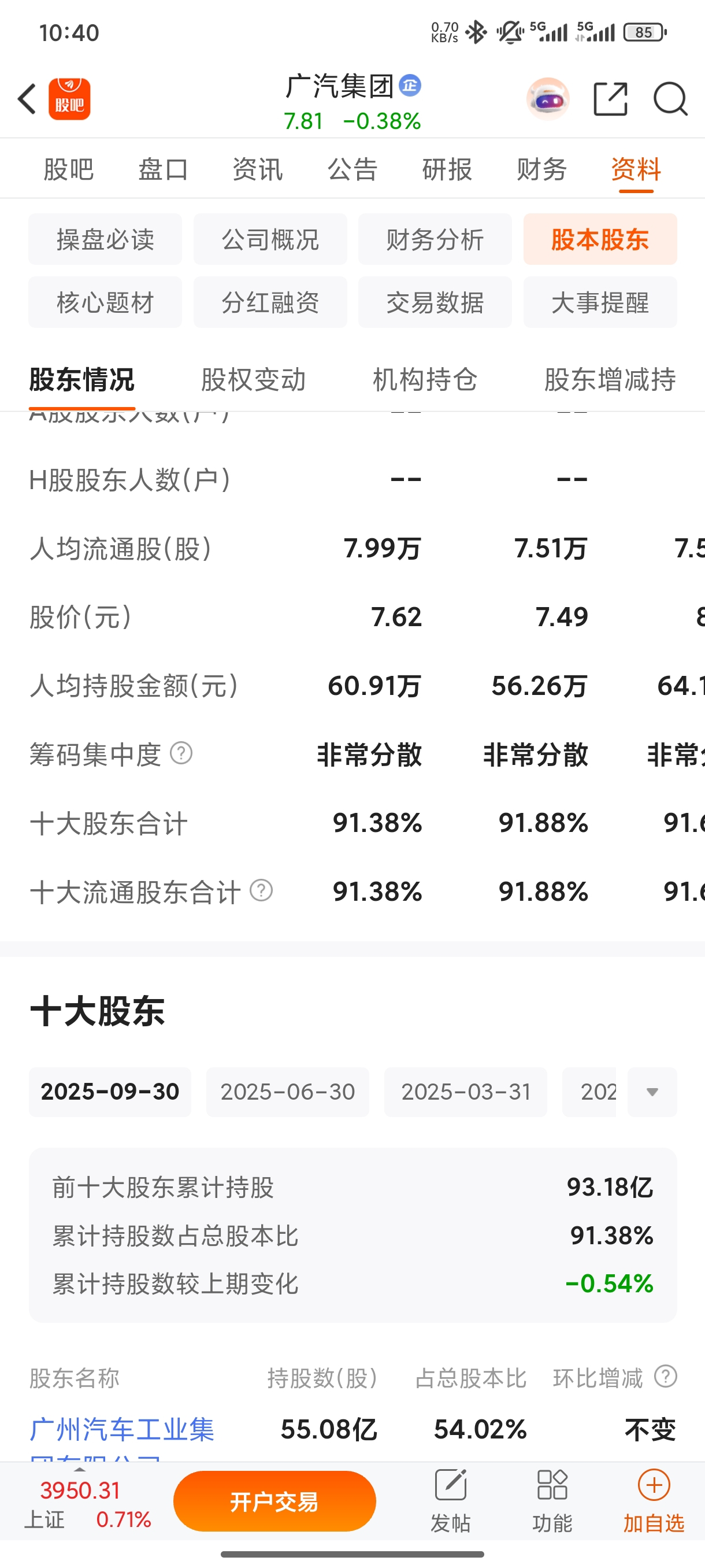 $广汽集团(SH601238)$ 十大股东91%的筹码,小散9%不到,大股东72%,根本没有砸盘的机会。十大股东早就知道财报了,要卖早卖了。散户9%周一卖,刚好股份更集中了。利中出净,机会明年大大的有