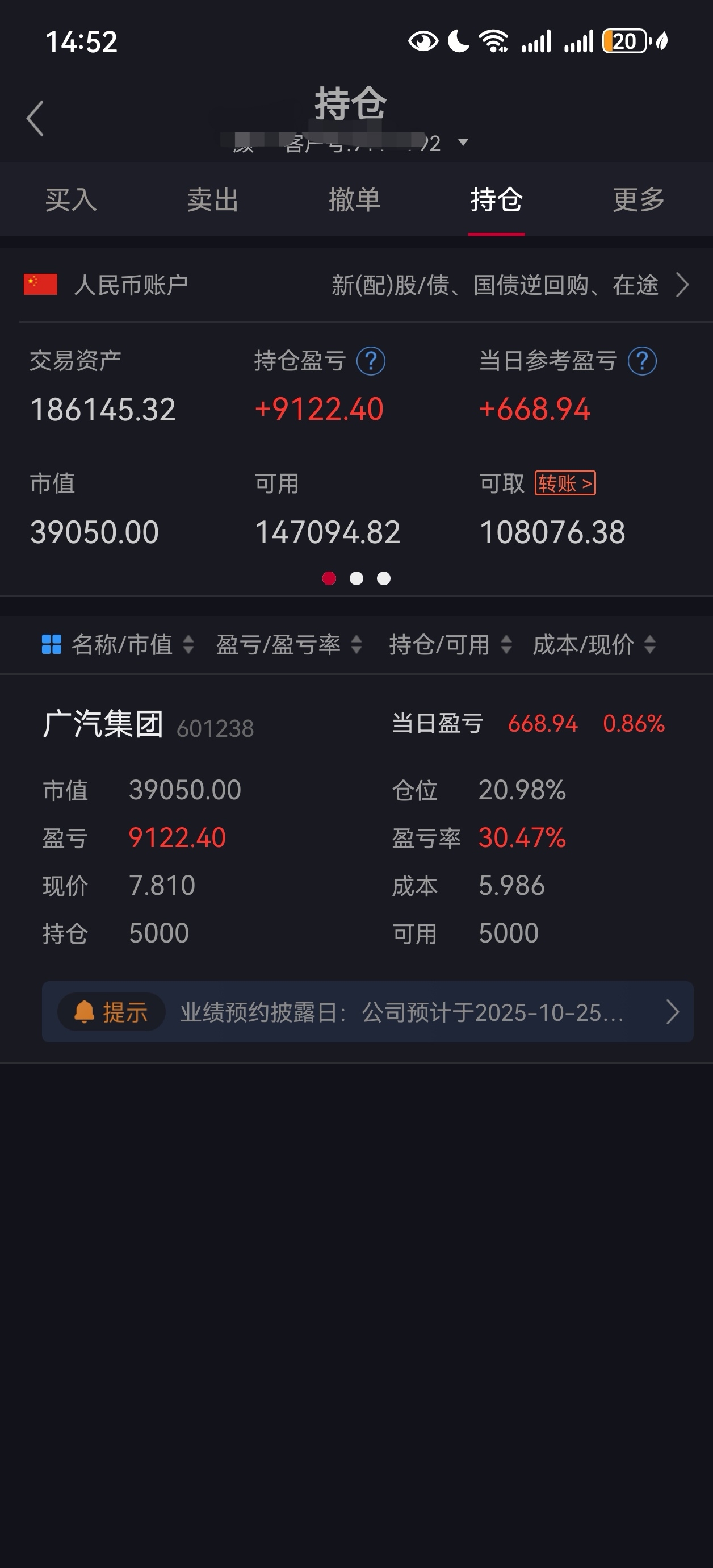 $广汽集团(SH601238)$ 这是什么玩意啊,大盘4000,它还在2600。基本上卖完了,留了一万股底仓,放着吧。我也不看了,也挣不到大钱。没意思,真没劲。已经把钱从账户里面转到卡里了,准备一部分放余额宝,剩下的去买一辆焕新版极氪001。