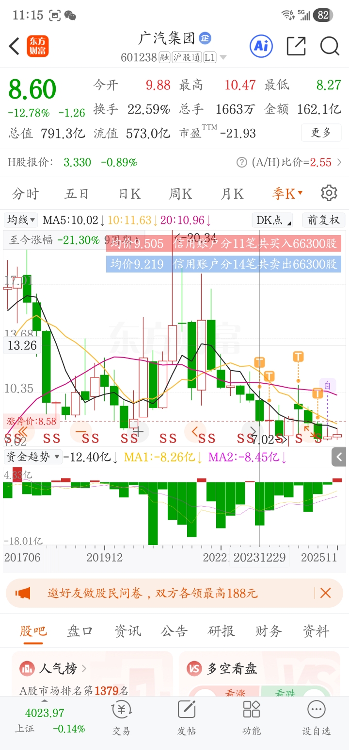 $广汽集团(SH601238)$ 好家伙,两年半九块多买过,现在跌到七块多了,当时指数在两千六,现在指数可是四千点啊