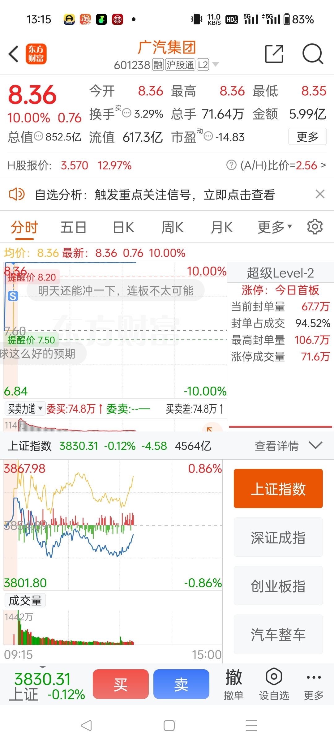 大盘都开始配合广汽了?保持这样。大盘来个放量