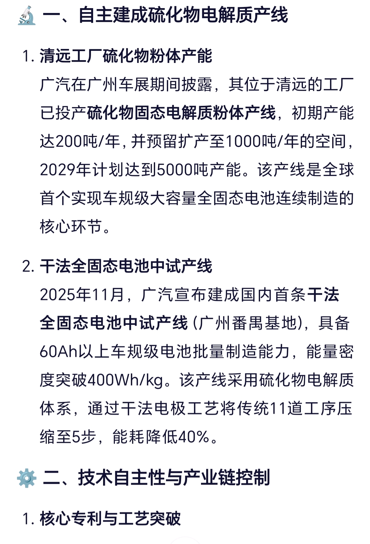 $广汽集团(SH601238)$ 广汽在广州车展期间披露,其位于清远的工厂已投产硫化物固态电解质粉体产线,初期产能达200吨/年,并预留扩产至1000吨/年的空间,2029年计划达到5000吨产能。该产线是全球首个实现车规级大容量全固态电池连续制造的核心环节。