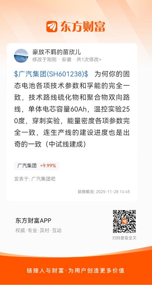 $广汽集团(SH601238)$ 为何你的固态电池各项技术参数和孚能的完全一致,技术路线硫化物和聚合物双向路线,单体电芯容量60Ah,温控实验250度,穿刺实验,能量密度各项参数完全一致,连生产线的建设进度也是出奇的一致(中试线建成)