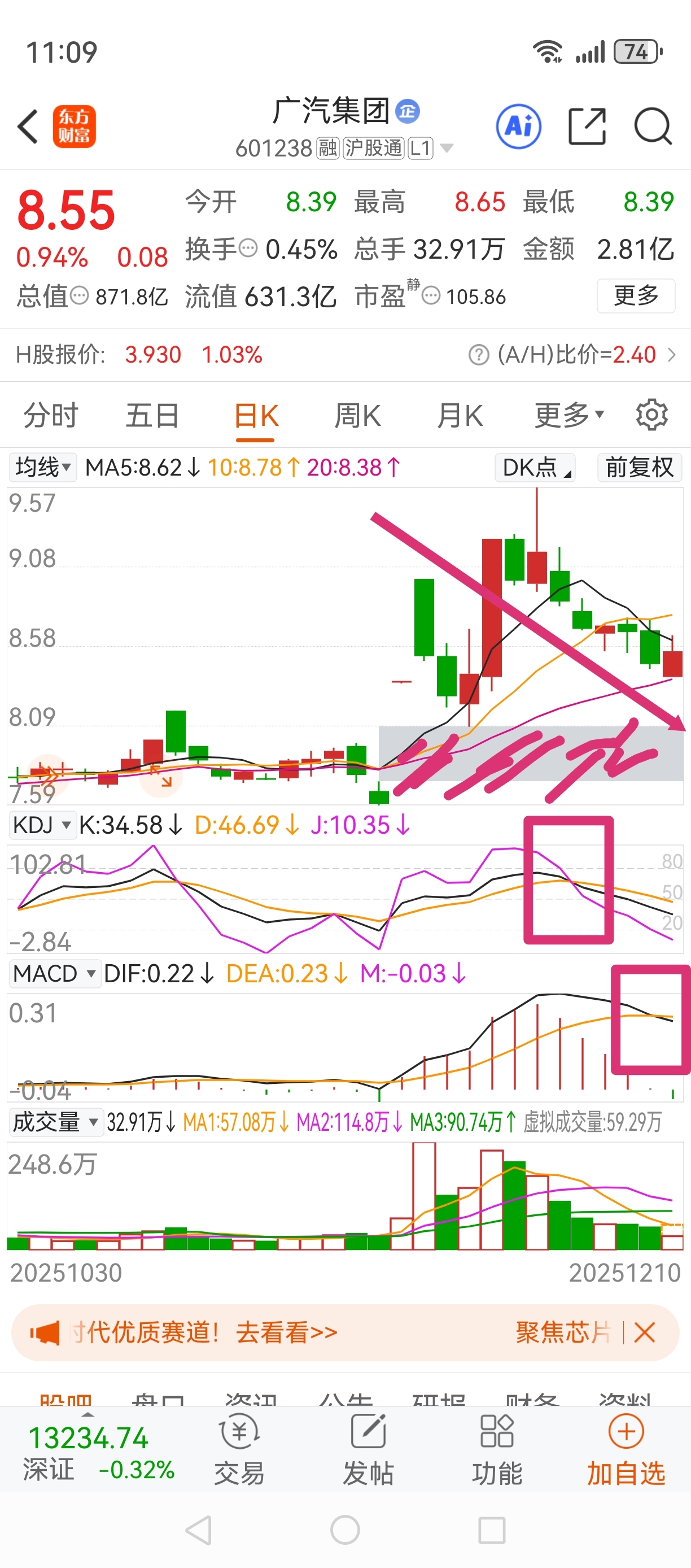 $广汽集团(SH601238)$ Macd死叉后平均修复周期3-8周,照此推算,考虑7.90~8.0企稳?这段时间港资一直拉高出货回收资金?