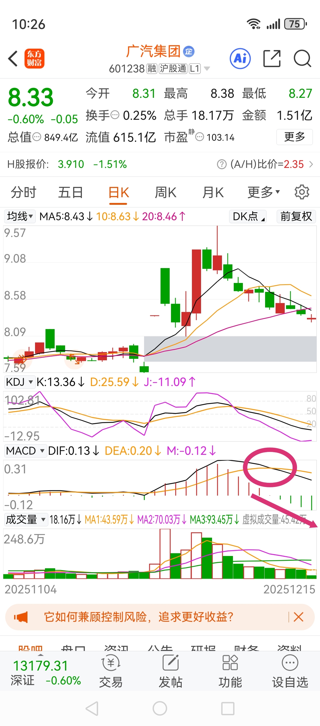 $广汽集团(SH601238)$ Macd死叉后的阴线还在继续向下拉长,远未见底,恢复金叉至少还需六周(30个交易日)。