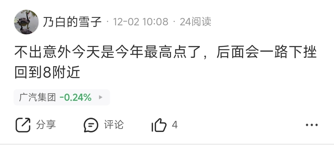 $广汽集团(SH601238)$ 距离12月2日最高点已经下来1.33元,离8块不远了,破8我会慢慢买进,7.7以下足部满仓