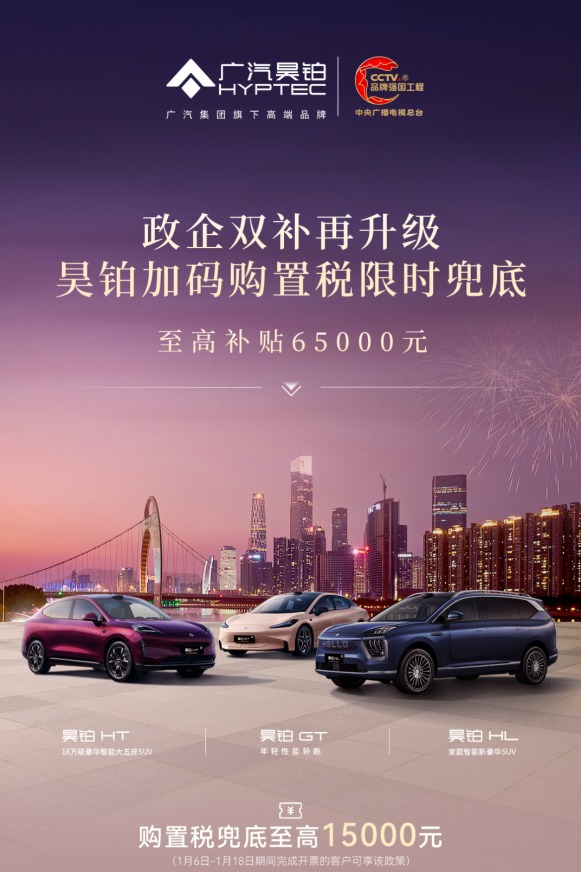 上证报中国证券网讯(记者俞立严)1月6日,广汽集团介绍,近日,广汽昊铂购车权益再加码,不仅以“政企双补”开启新年购车礼遇优惠,还围绕用户全周期拥车体验持续升级服务,并再加码新能源购置税兜底政策,综合补贴最高可达65000元。