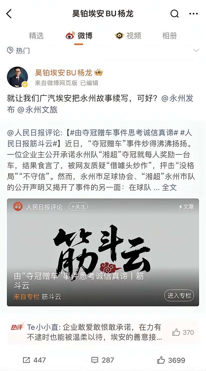 广汽埃安品牌将向湖南永州足球胜利的队员一人提供一台车!