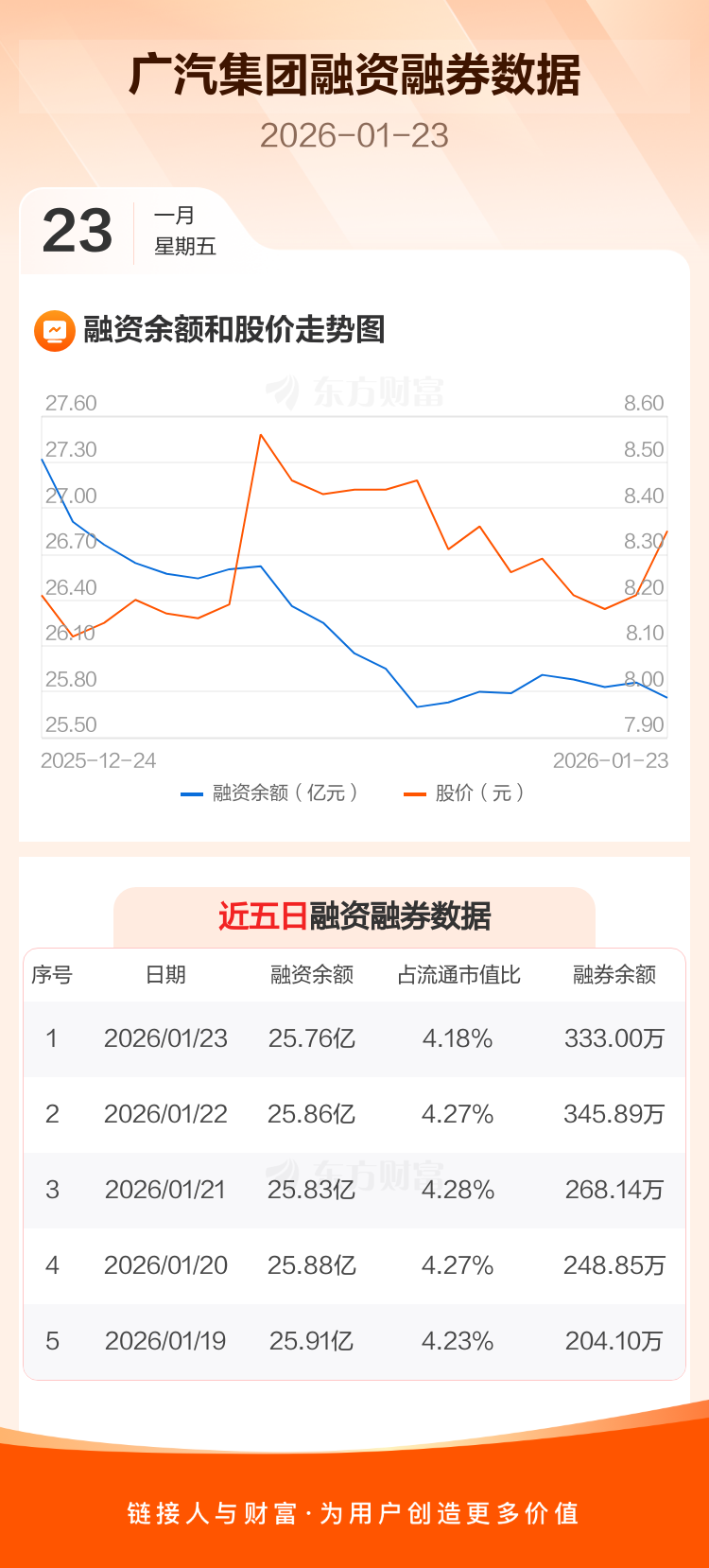 交易所最新数据显示,广汽集团于2026年1月23日获融资买入3711.01万元,融资偿还4662.36万元,当日融资净偿还951.35万元。目前,该股融资余额25.76亿,占流通市值比例为4.18%。