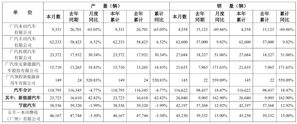 2月1日,广汽集团(601238/02238)发布公告,2026年1月份的汽车产销量情况显示,1月汽车产量为11万辆,同比下降4.77%,1月汽车销量为12万辆,同比增长18.47%。