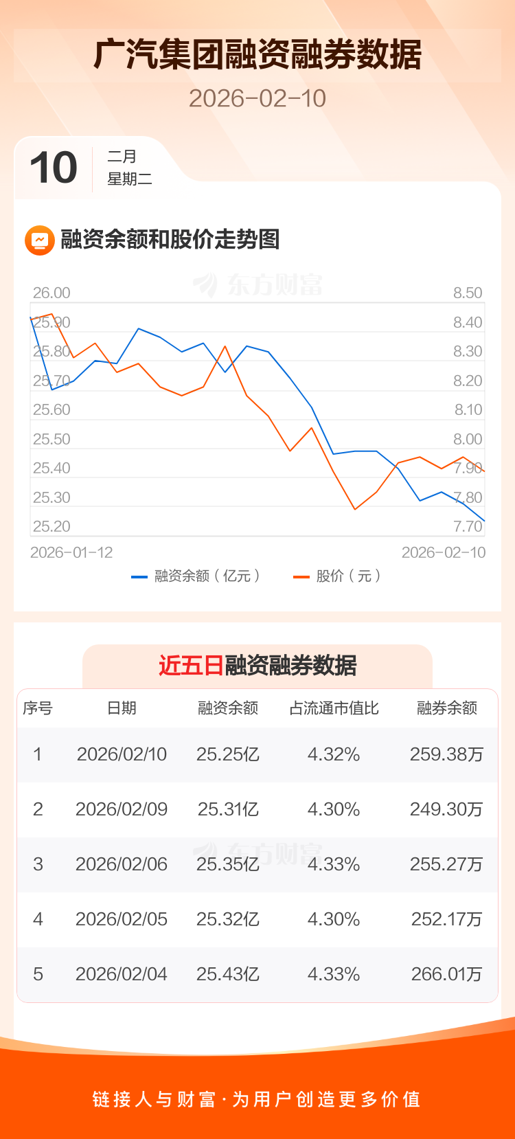 交易所最新数据显示,广汽集团于2026年2月10日获融资买入1096.23万元,融资偿还1706.52万元,当日融资净偿还610.3万元。目前,该股融资余额25.25亿,占流通市值比例为4.32%。