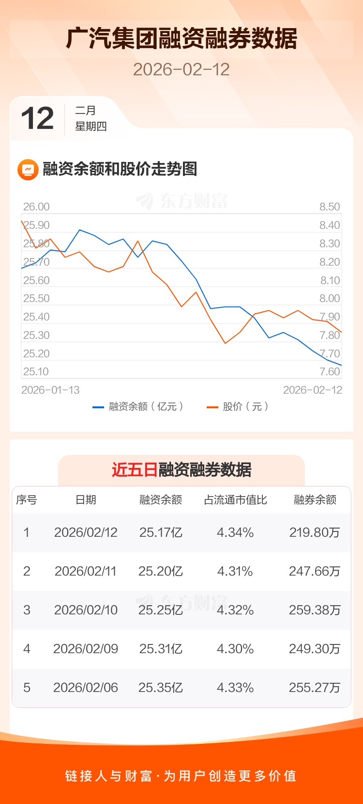 交易所最新数据显示,广汽集团于2026年2月12日获融资买入965.18万元,融资偿还1226.26万元,当日融资净偿还261.08万元。目前,该股融资余额25.17亿,占流通市值比例为4.34%。