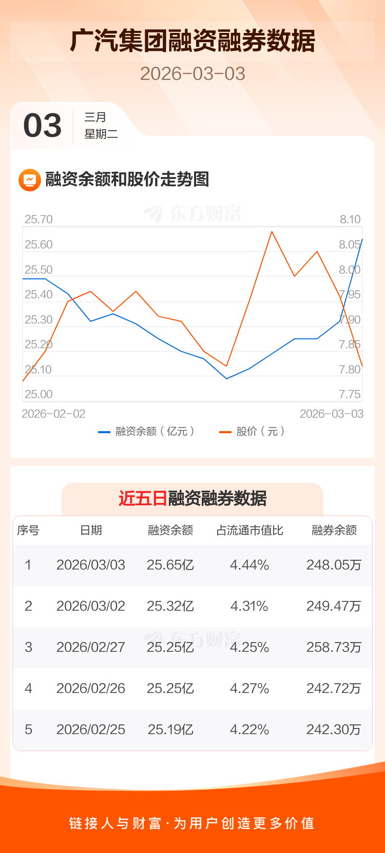 交易所最新数据显示,广汽集团于2026年3月3日获融资买入5026.03万元,融资偿还1696.94万元,当日融资净买入3329.09万元。目前,该股融资余额25.65亿,占流通市值比例为4.44%。