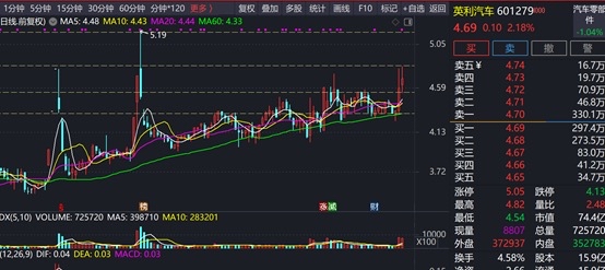 近期呈现震荡上行趋势,短期均线粘合,但总体呈上升趋势。当前关键支撑位可看4.54元(近期回调低点)和4.33元(20日低点),阻力位关注5.19元附近。短期若能站稳在4.70元上方,就有望继续挑战5.19元阻力;反之若跌破4.54元支撑,则可能重回震荡。
