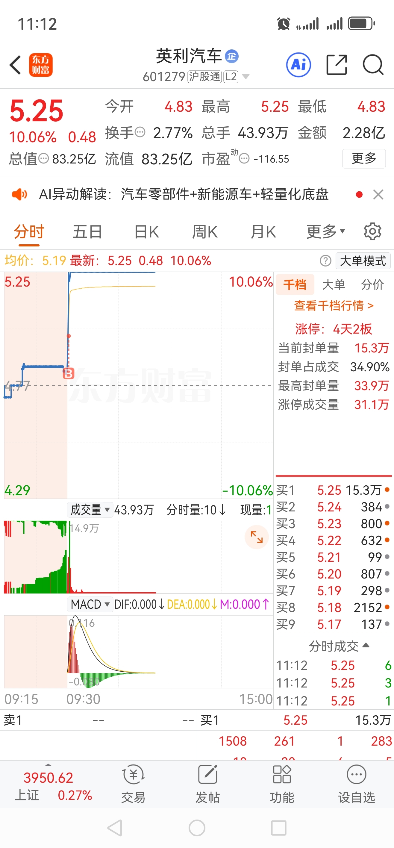 $英利汽车(SH601279)$ 今天全市场首板第一个涨停的