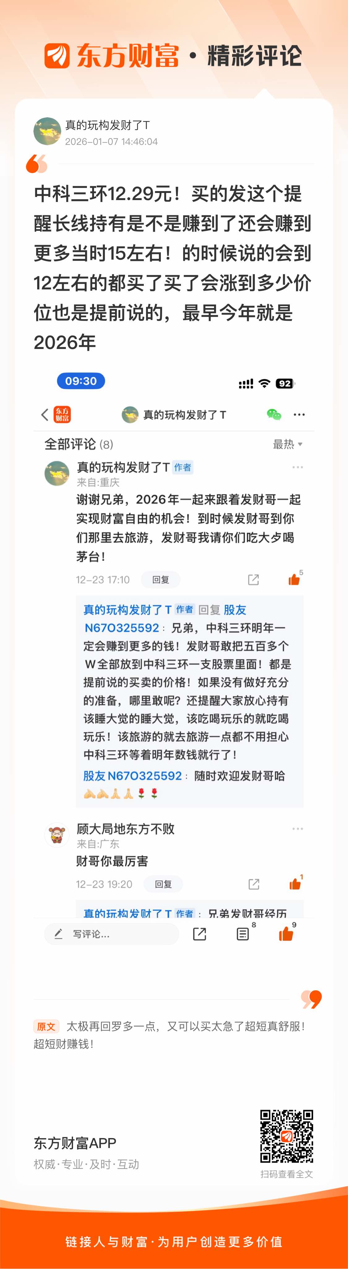 点赞的都是看到了的,让那些那些旺旺眼红! 中科三环12.29元!买的发这个提醒长线持有是不是赚到了还会赚到更多当时15左右!的时候说的会到12左右的都买了买了会涨到多少价位也是提前说的,最早今年就是2026年!