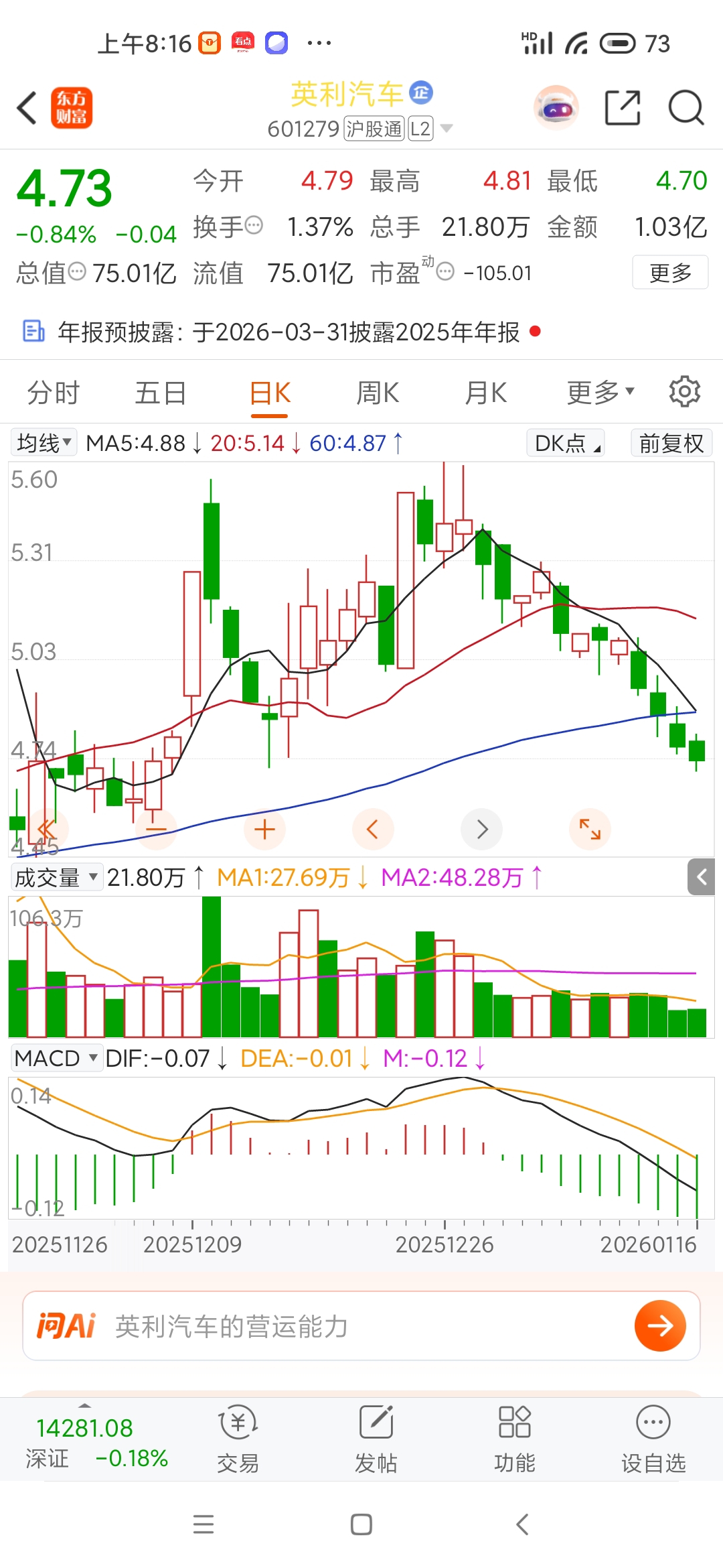 $英利汽车(SH601279)$ 被5日线压制,趋势最丑的票,周一还会低开,如果低开高走站上5日线才可以加仓或进场,其实业绩预告年报亏损并非是利空,都是明牌了,还有可能第四季度业绩得到改善,但主力总会利用消息玩弄散户,你担心什么它就来什么,趁机拿更低的筹码,总之英利下周看涨