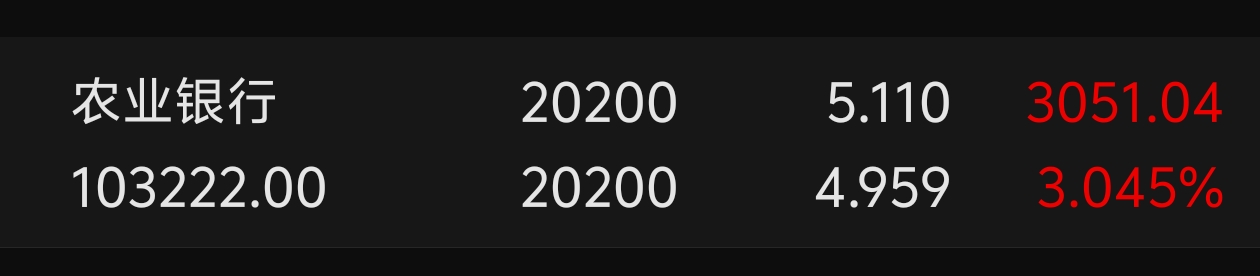 $农业银行(SH601288)$ 我的农业银行正在慢慢建仓,初步建仓预计十万股打底,接下来的一点时间会慢慢操作农业银行,直至安全价位,目前持有20200股,成本4.959,计划在今年分红之前把持股成本做到绝对安全的价位区间,发帖只为记录自己的投资思路逻辑,不构成投资建议