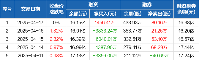农业银行:融资净买入1456.41万元,融资余额16.15亿元(04-17)