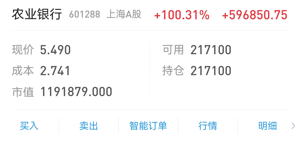 $农业银行(SH601288)$ 成本2.741,不舍得卖啊,分红每年都10%