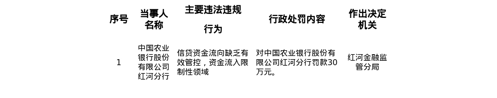 中国农行红河分行被罚30万,涉信贷资金流向管控不力等