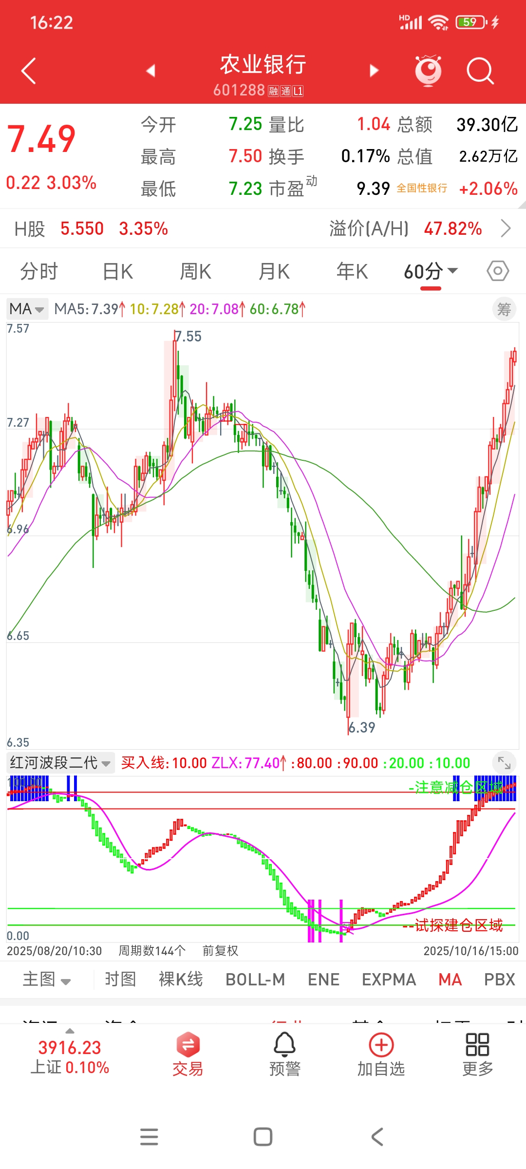 $农业银行(SH601288)$ 这波60分钟级别的上行这么猛我是没想到的,这里注意随时止盈就好。