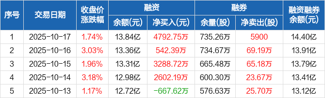 融资方面,当日融资买入3.26亿元,融资偿还2.78亿元,融资净买入4792.75万元,连续4日净买入累计1.12亿元。融券方面,融券卖出30.06万股,融券偿还29.47万股,融券余量735.26万股,融券余额5602.68万元。融资融券余额合计14.4亿元。