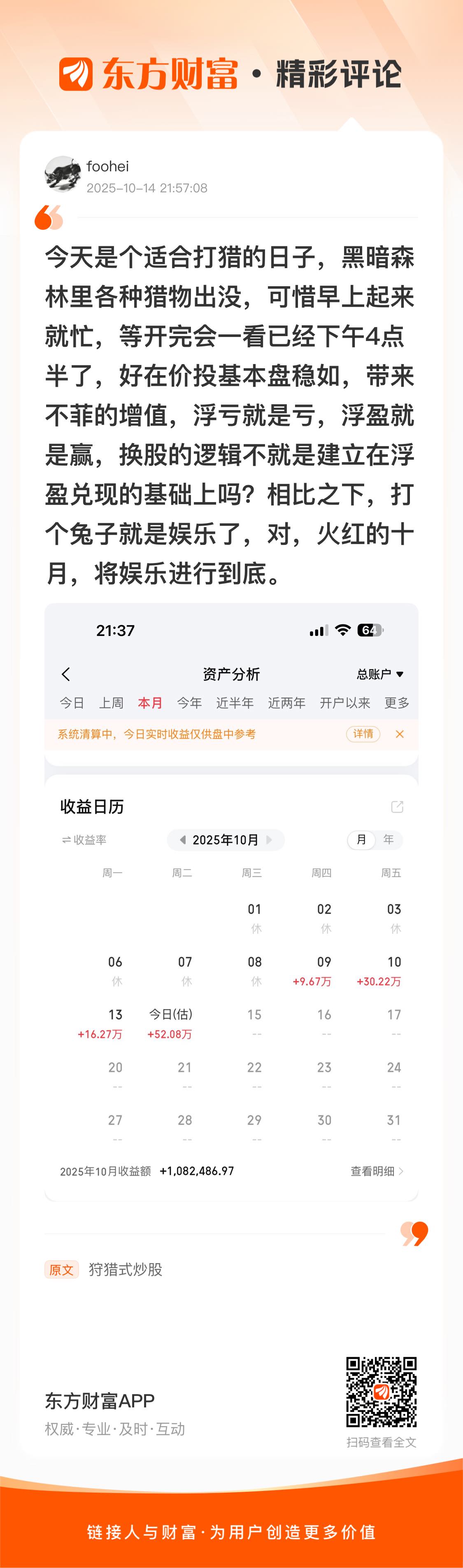 开宗立派:禅猎派//@foohei : 今天是个适合打猎的日子,黑暗森林里各种猎物出没,可惜早上起来就忙,等开完会一看已经下午4点半了,好在价投基本盘稳如,带来不菲的增值,浮亏就是亏,浮盈就是赢,换股的逻辑不就是建立在浮盈兑现的基础上吗?相比之下,打个兔子就是娱乐了,对,火红的十月,将娱乐进行到底。