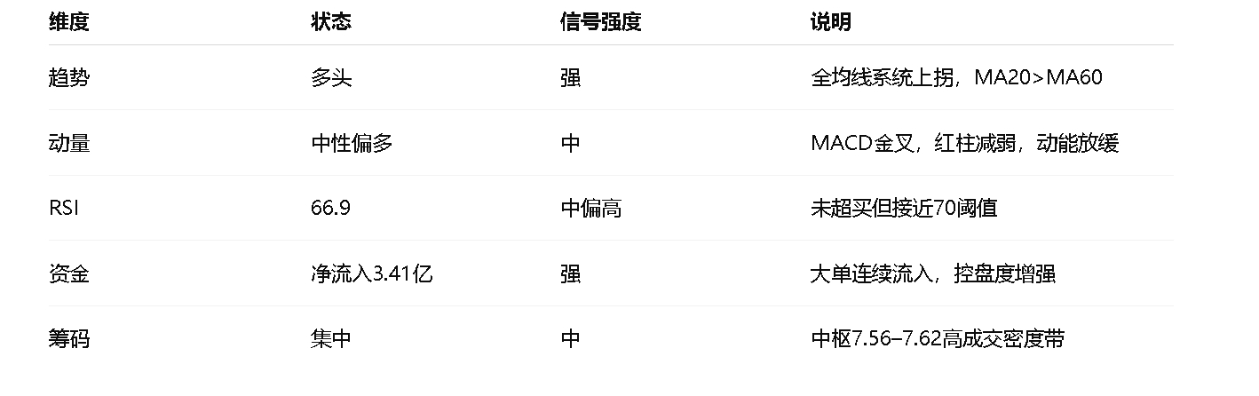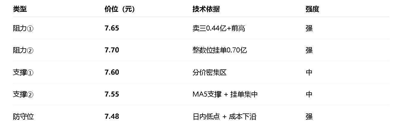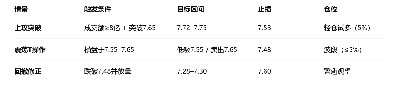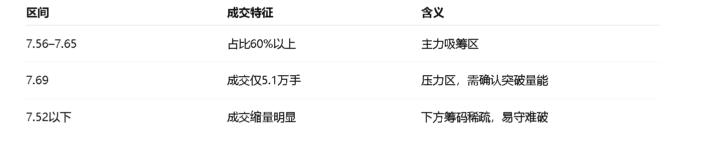 价位7.56–7.65元为短期“中枢吸筹带”,若连续三日站稳,或形成新平台。