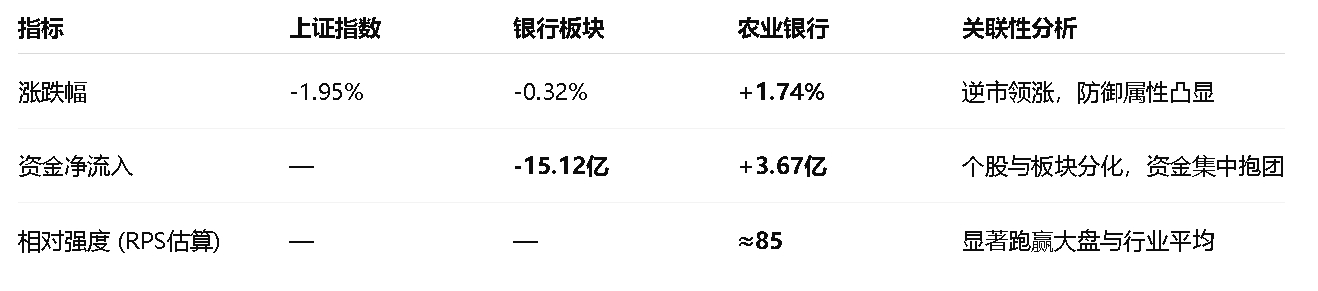 · 板块整体承压,但主力资金选择农行作为防御性配置标的,体现机构抱团与流动性溢价效应。