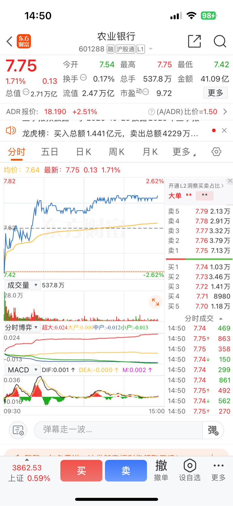 $农业银行(SH601288)$ 7.75拖了一个下午,看看收盘前能不能拿下