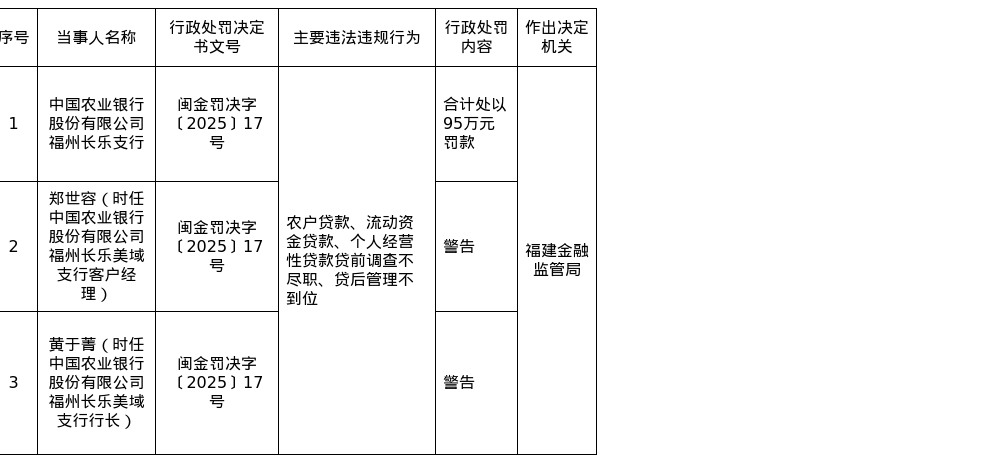 农行福州长乐支行被罚95万,涉贷前调查不尽职等