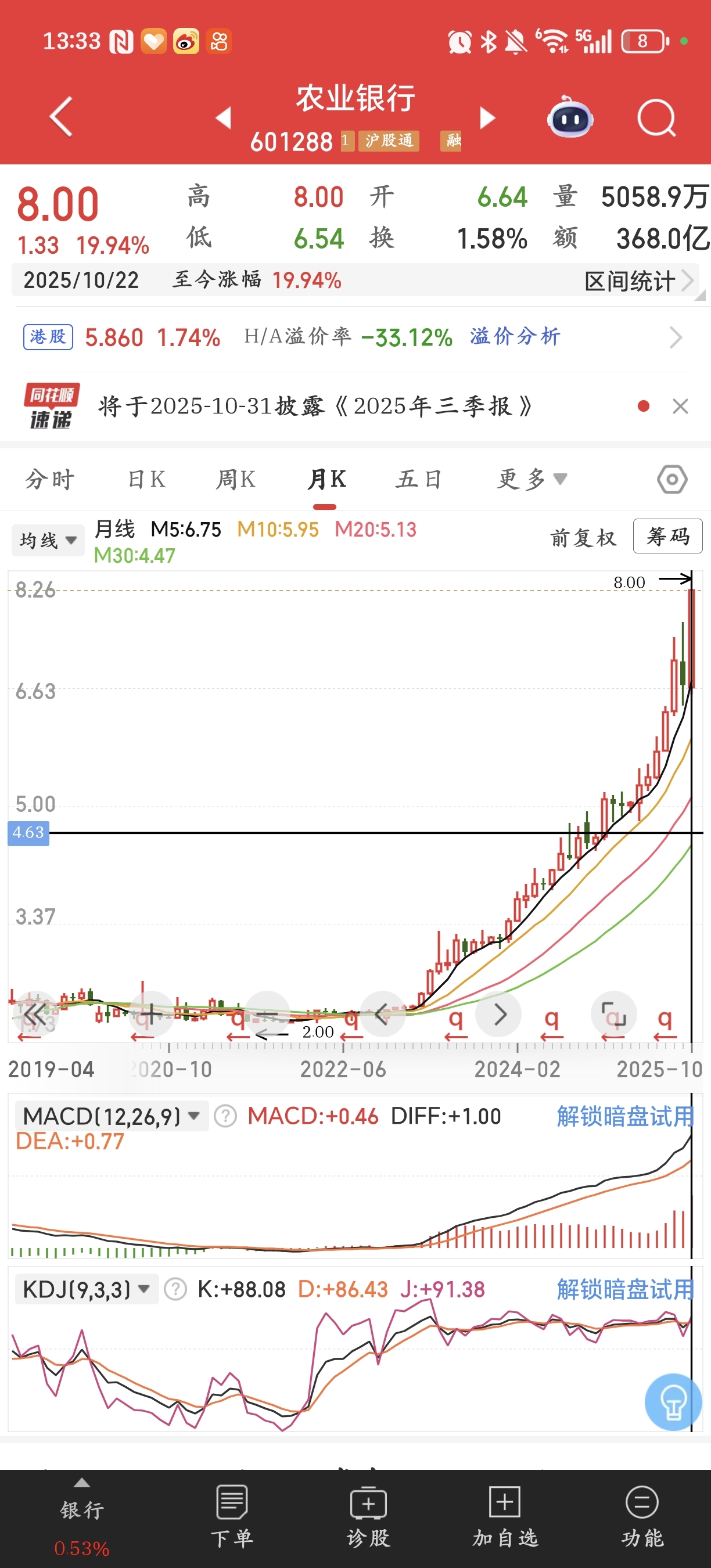$农业银行(SH601288)$ 10月份涨了20个点了!!???确实离谱 368亿成交额,市值增长5000亿?