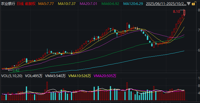 值得注意的是,农业银行盘中再创历史新高,近期已连续14个交易日收阳。