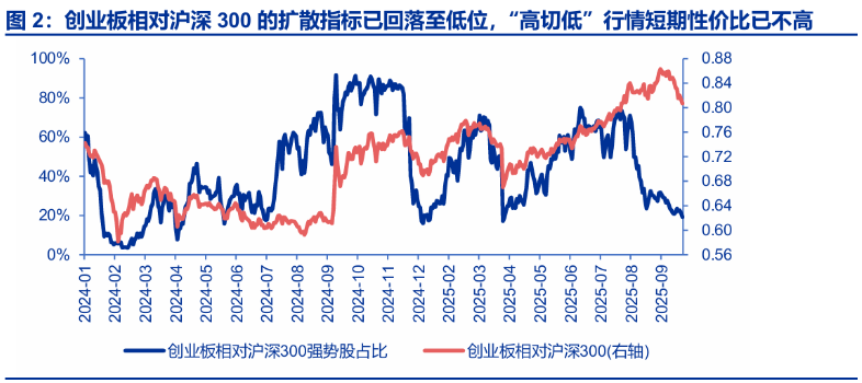 顺周期和价值行情暂时无法引领总体指数再上台阶,A股有效突破,最终还是要等科技引领。从性价比来看,A股总体的赚钱效应已回落至中低位,调整波段已接近尾声;同时创业板相对沪深300的扩散指标已回落至低位,“高切低”行情短期性价比已不高。