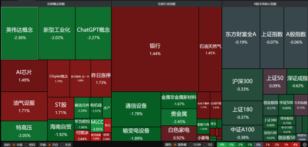 昨日A股三大指数集体收跌,沪指震荡整理,收盘跌0.07%,深证成指跌0.62%,创业板指跌0.79%。沪深两市成交额不足1.7万亿。行业板块涨少跌多,采掘行业、风电设备、房地产服务、工程机械、房地产开发板块涨幅居前,贵金属、珠宝首饰、船舶制造、煤炭行业、燃气板块跌幅居前。