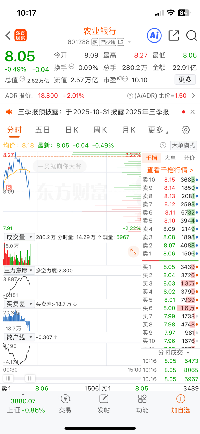 $农业银行(SH601288)$ 我一手的威力这么大吗