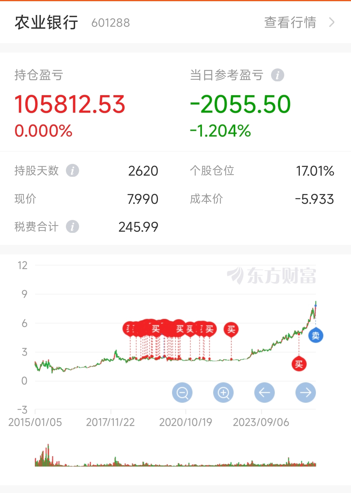$农业银行(SH601288)$ 兄弟们一年就买几千块钱,买了8年了。今天我换仓了,继续坚持等分红。兄弟们发财,下个10年见。
