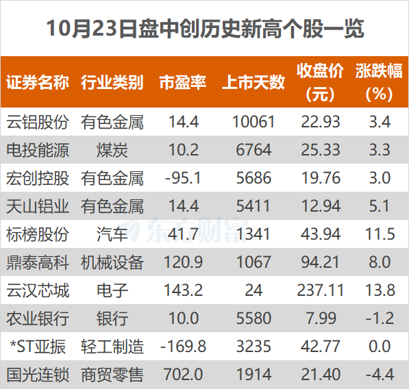 10月23日,A股三大指数今日集体上涨,截止收盘,沪指涨0.22%,收报3922.41点;深证成指涨0.22%,收报13025.45点;创业板指涨0.09%,收报3062.16点。东方财富Choice数据显示,今日有10只个股盘中股价创历史新高,分别为农业银行、云汉芯城等。