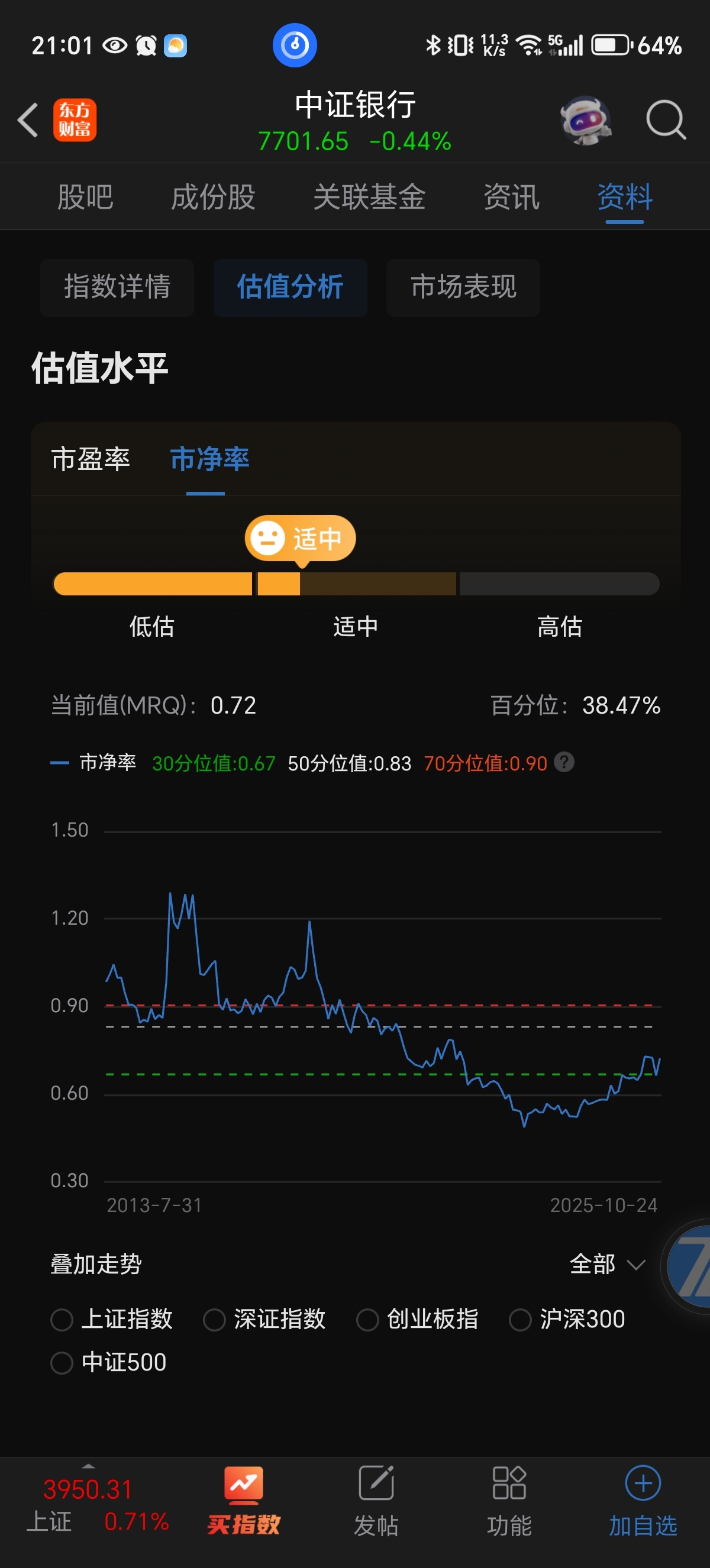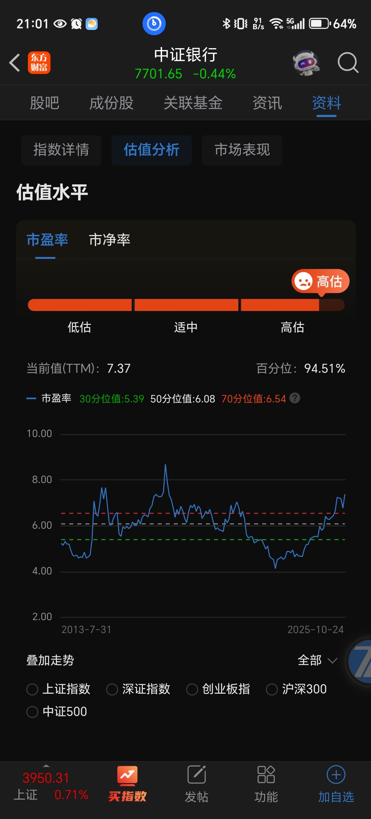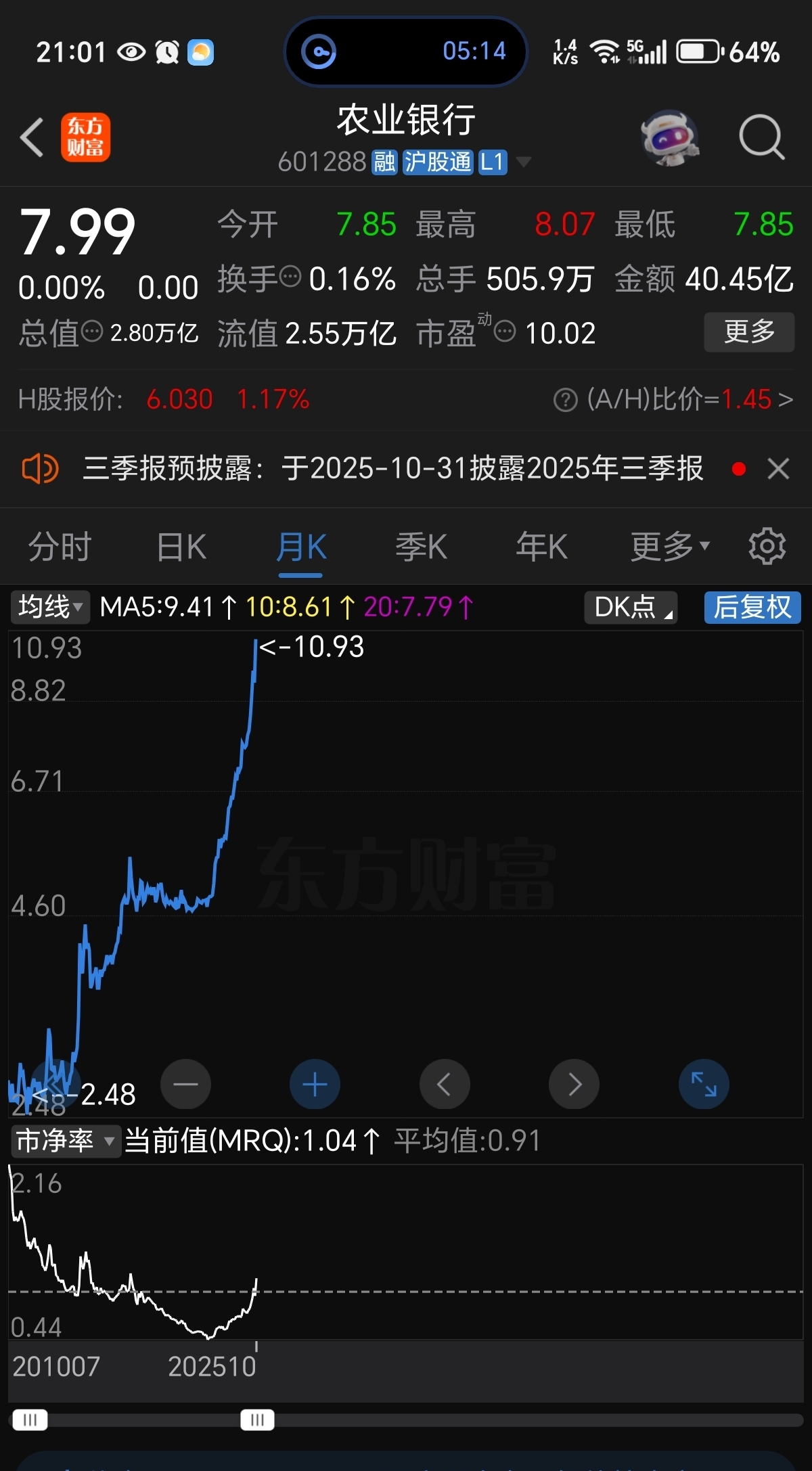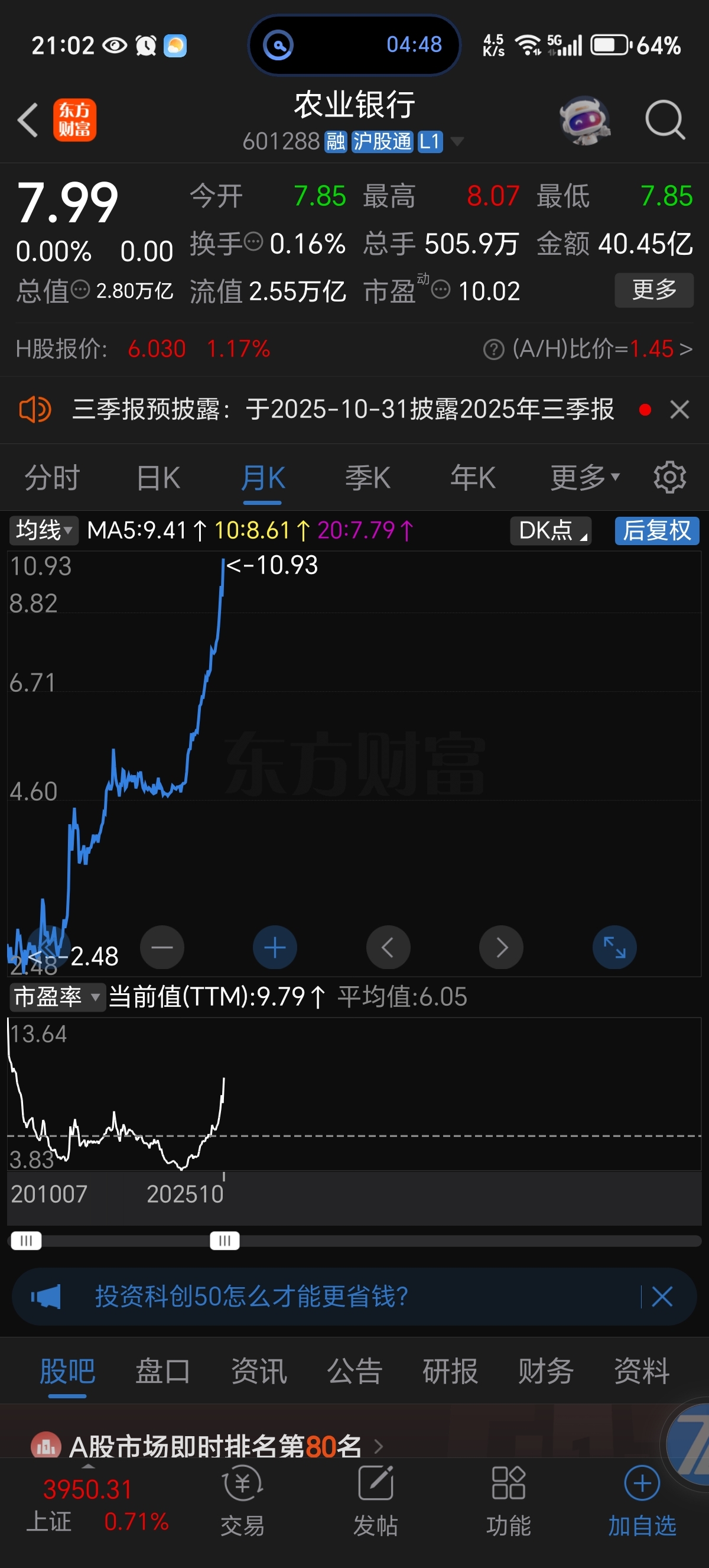 $农业银行(SH601288)$ 因为截至目前中证银行的pe是7.37,pb是0.72;