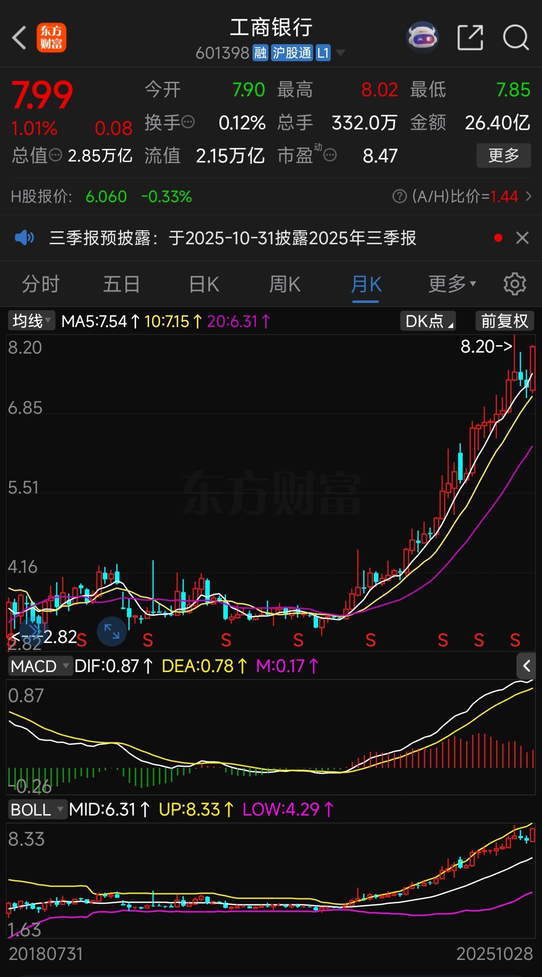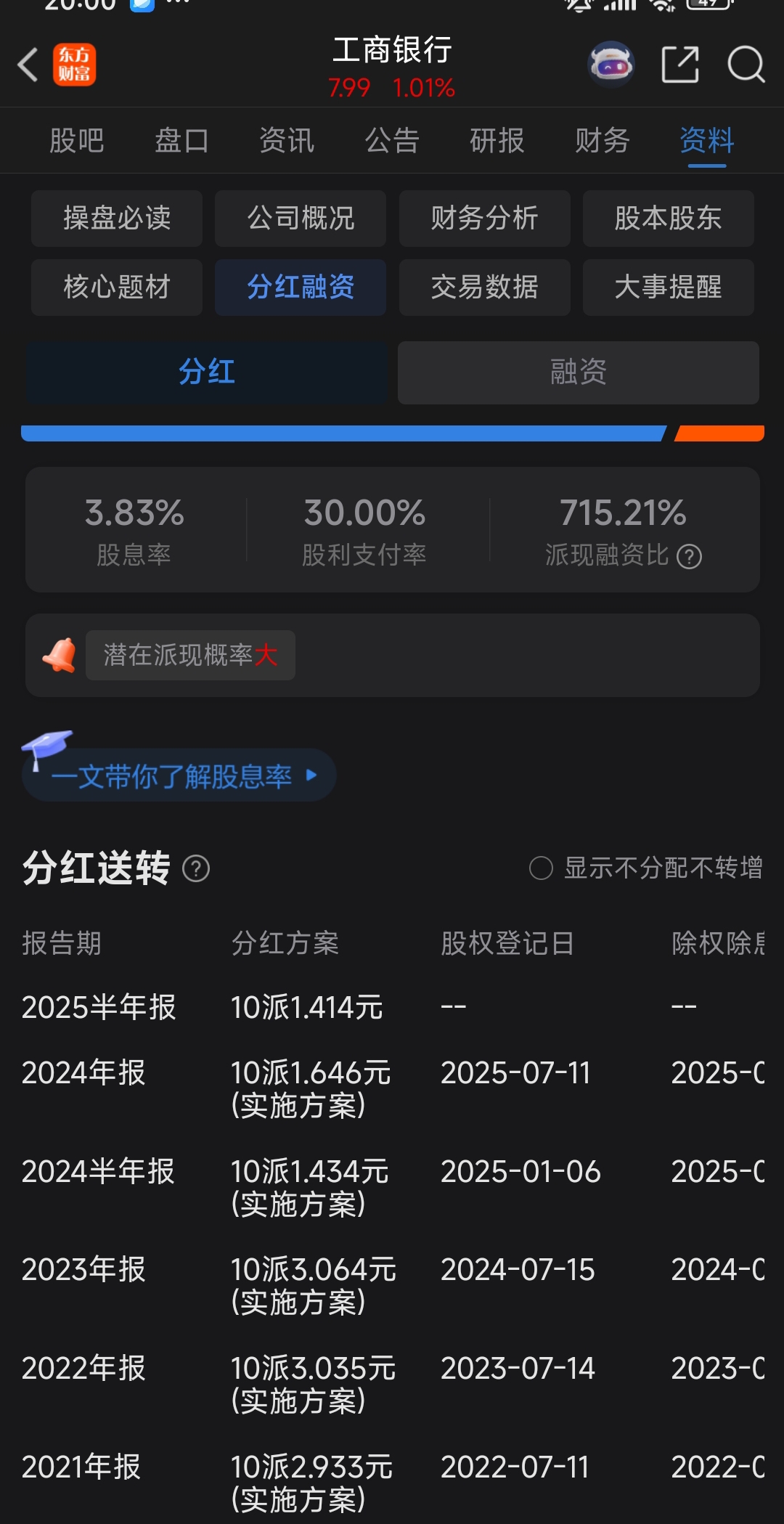 工商银行股价7.99元,2021~2024年连续4年的现金分红是0.2933~0.3080元,股息率达到 3.8%,超过 农业银行近 1个百分点了。