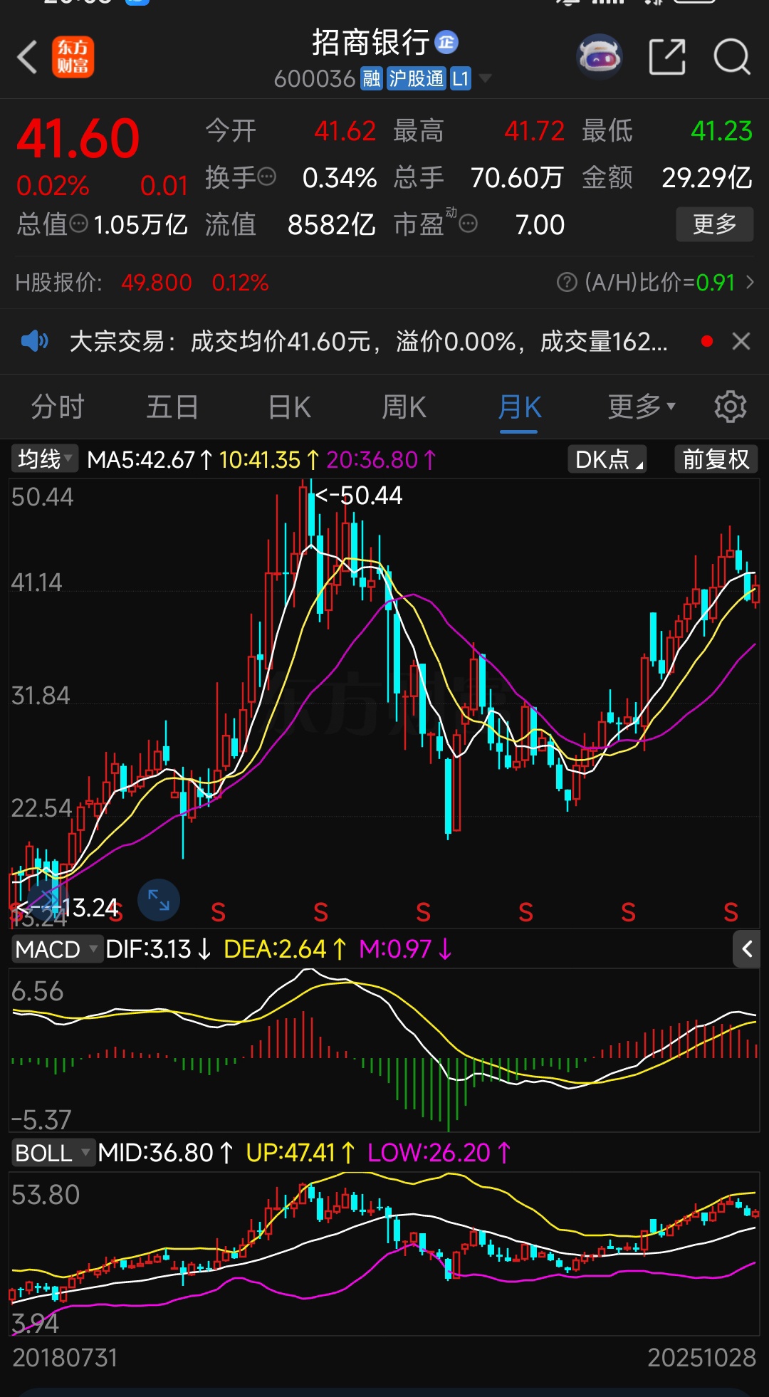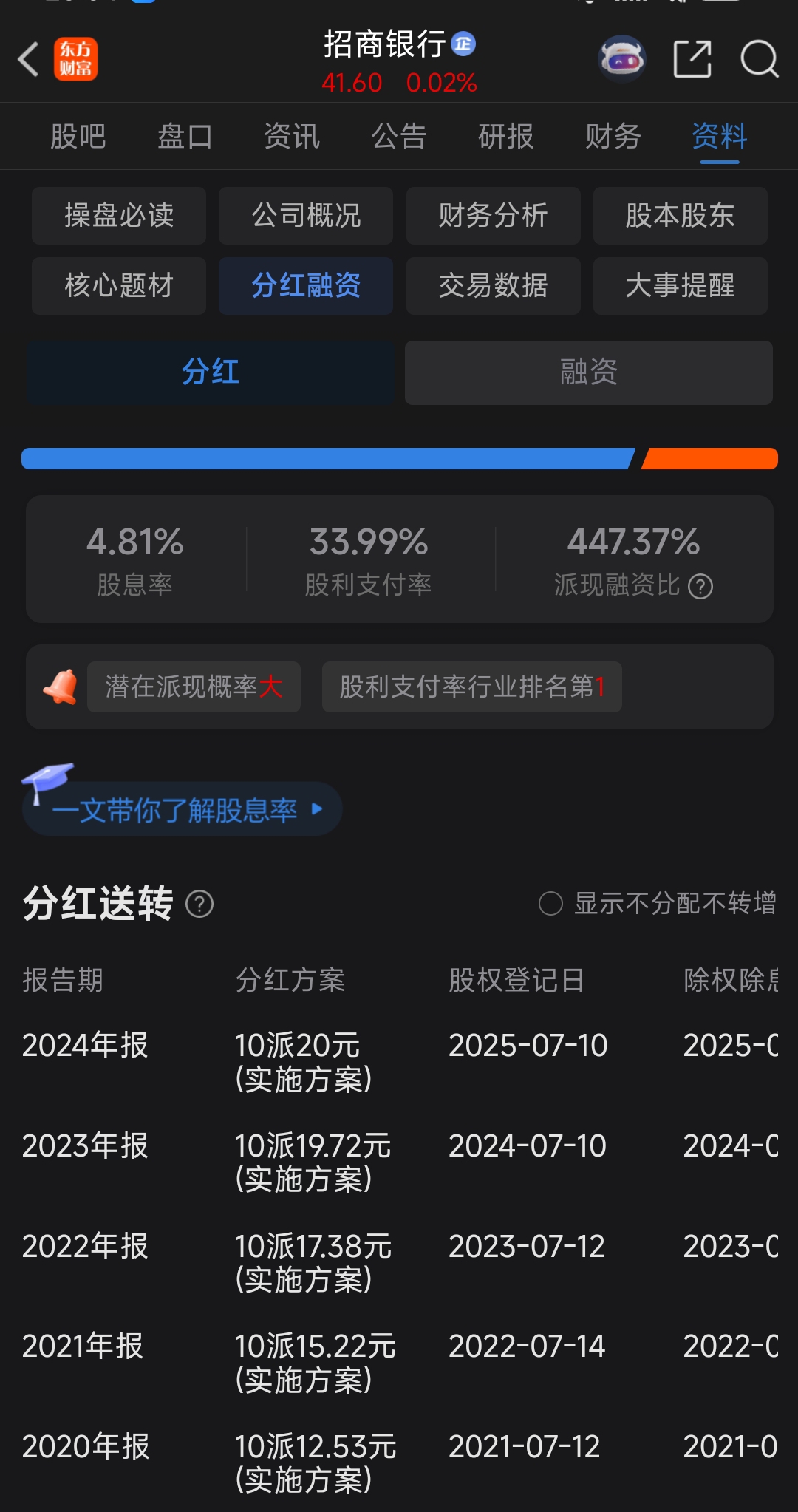今天收盘 41.60元对应2024年2元/股的现金分红股息率达到 4.81%,明显高于几大国行。