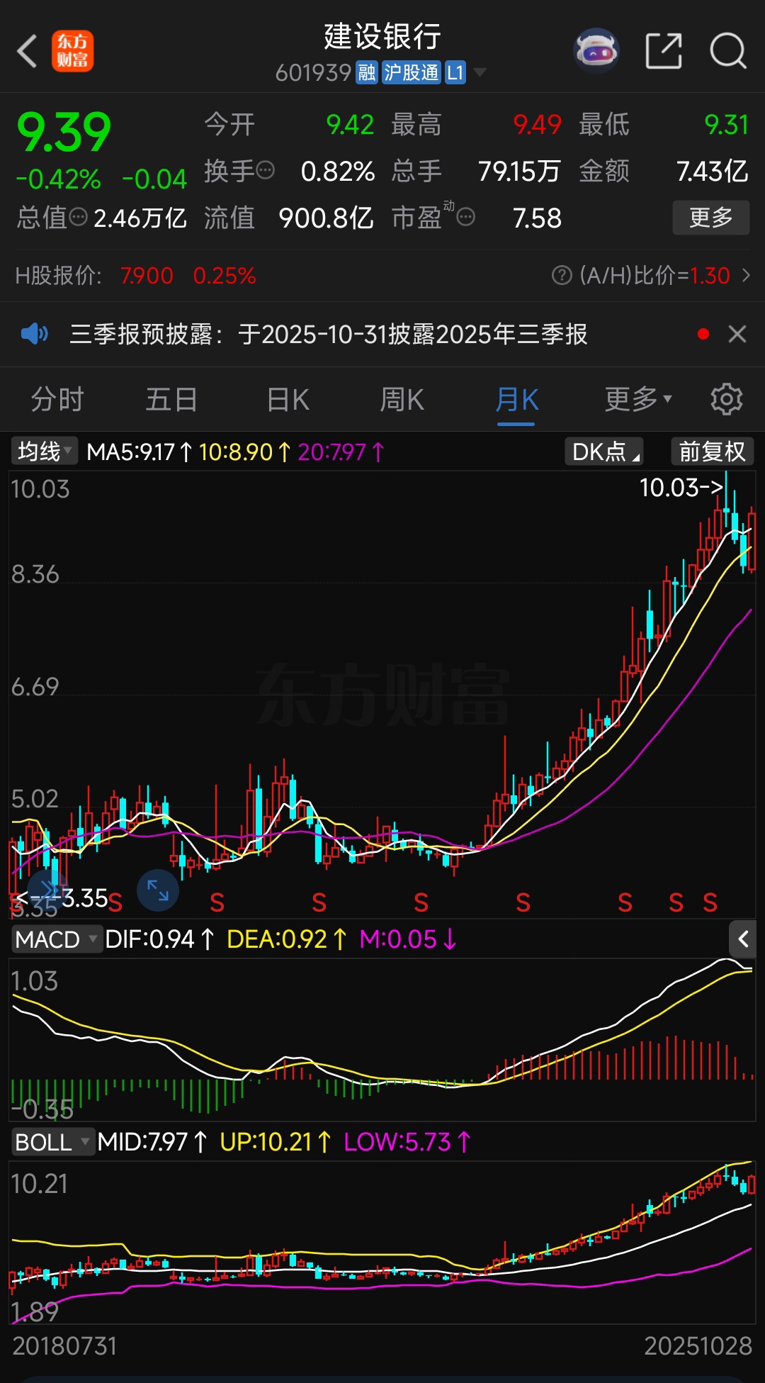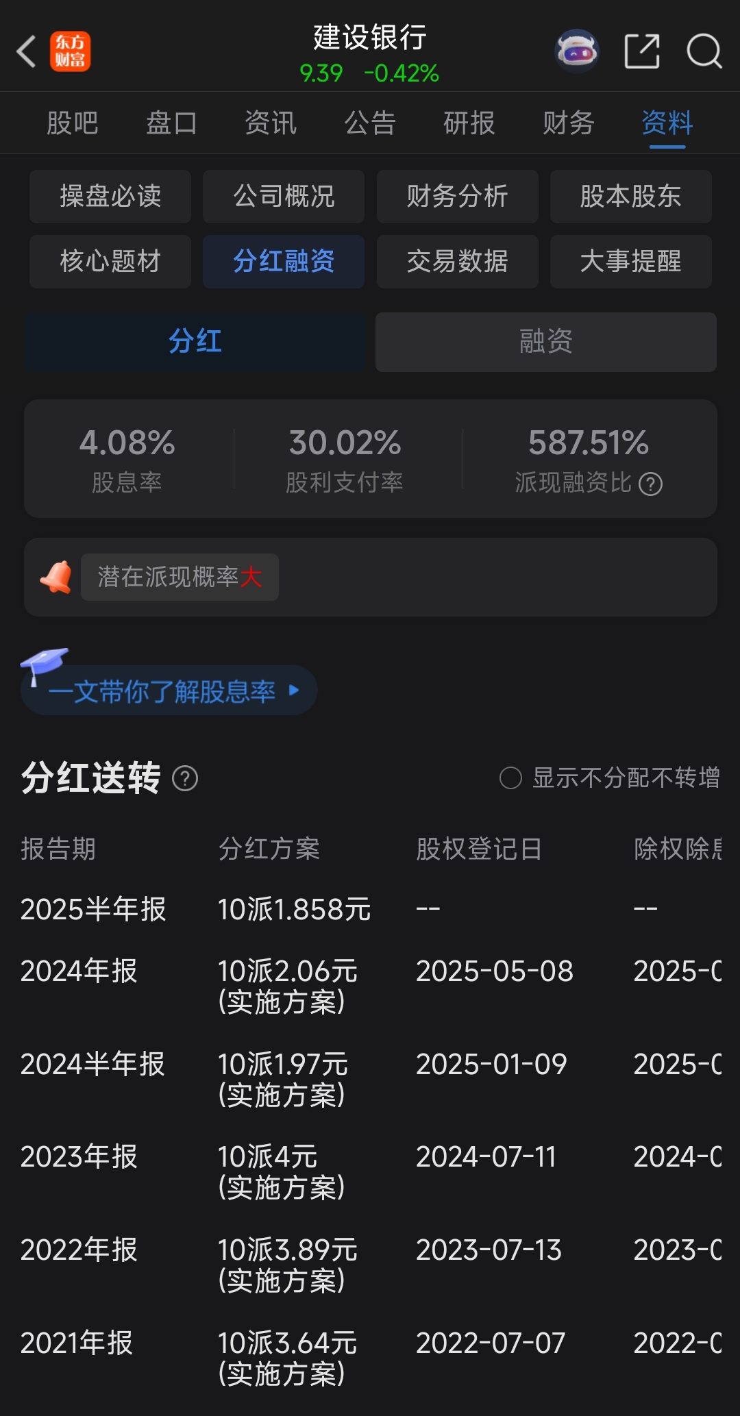 建设银行当前股价对应的股息率超过了4%,而农业银行不到3%,差距有点大哈。