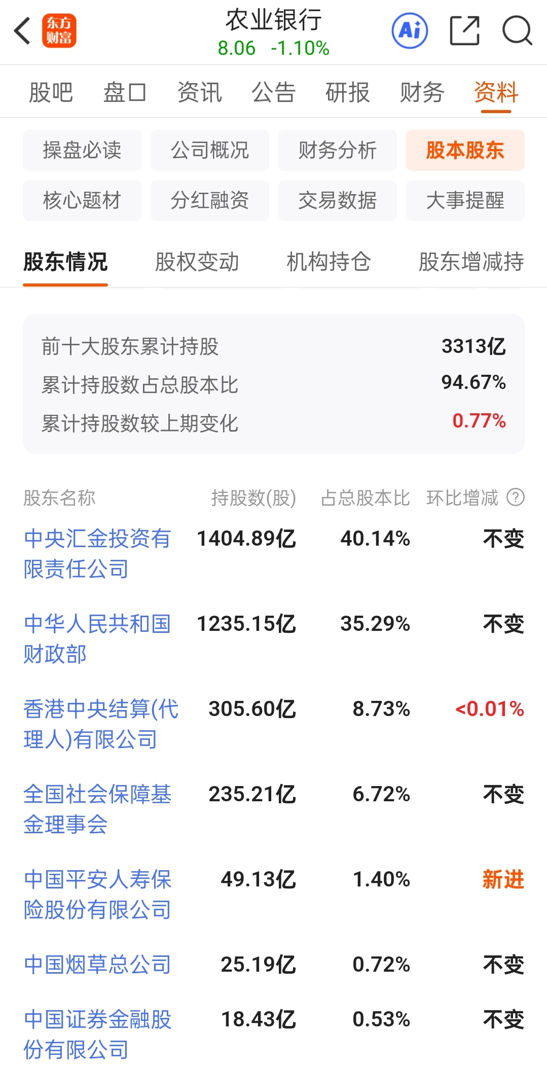 $农业银行(SH601288)$ 终于见识长线资金了,平安人寿保险,买了49亿股,这不得300+亿?