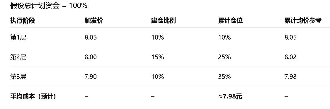我们来精确拆解一下:提到的 7.95、8.00、8.05 这三个价位,确实是一个典型的 “5分钱叠加分批建仓带”,属于低波切入的最佳执行结构**。